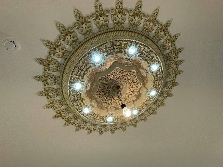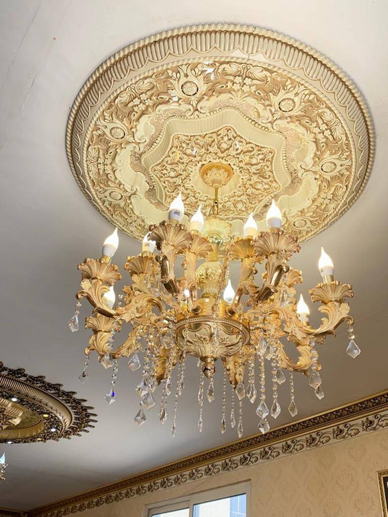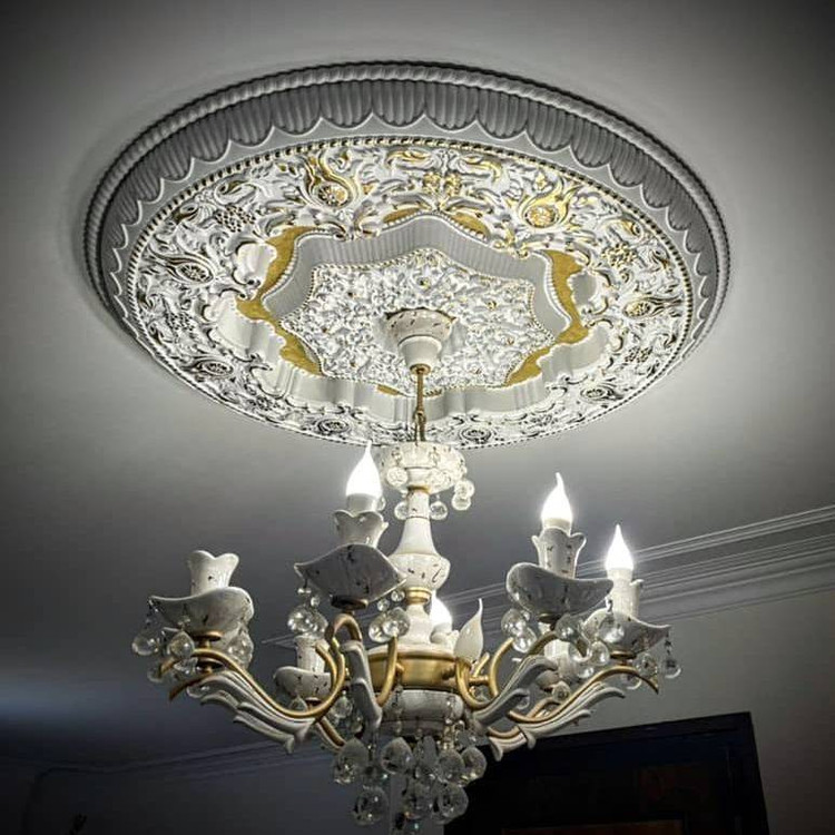 قیمت گل سقفی دور لوستری زیر لوستری پیش ساخته تزیین سقف دایره شمسه پی وی سی قابل شستشو سپاهان سقف  سفید طلایی